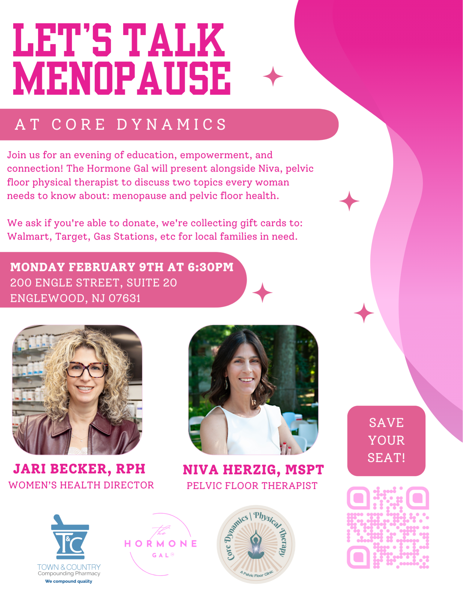 Join us for an evening of education, empowerment, and connection! The Hormone Gal will present alongside Niva Herzig, pelvic floor physical therapist to discuss two topics every woman needs to know about: menopause and pelvic floor health.